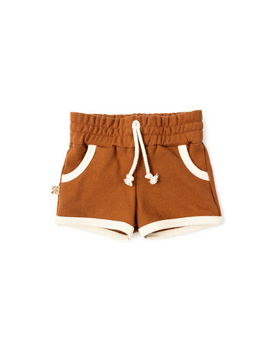 A shorter, retro inspired summer short! Features a wide & comfy elastic waist, faux drawstring, and binding around the legs for the classic track short look! Fabric content: 100% CottonRead More -