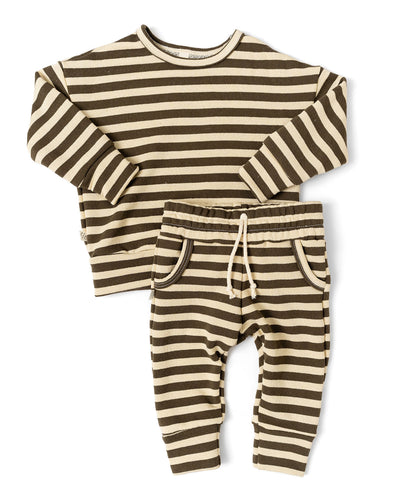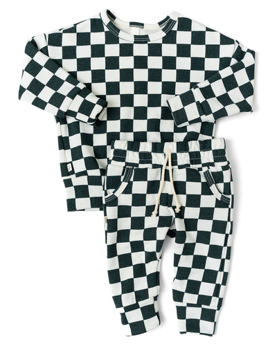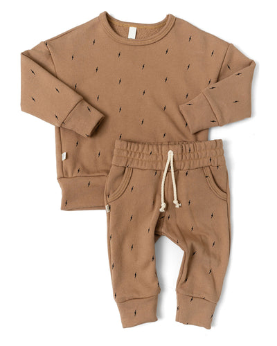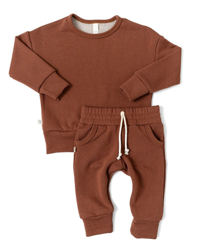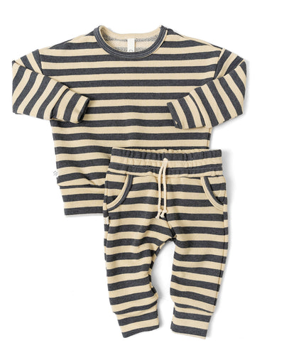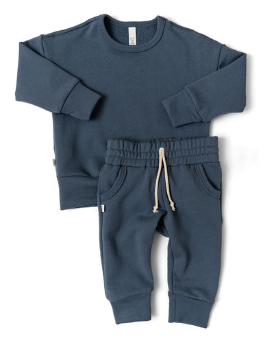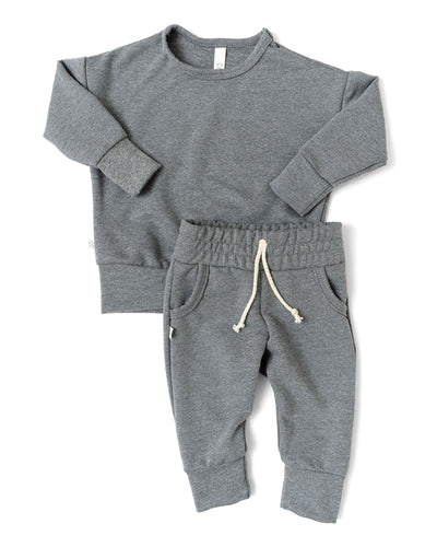 Boxy Set: Our new boxy sweatshirt has a loose, casual, unisex fit, and a rib collar. Made of our signature soft & cozy french terry fabric which has been milled and pre-washed just for our line. So cute & versatile on tiny babies & big kids alike! Cozy, straight leg pants with a wide elastic waistband, faux drawstring, functional pockets and cuffs at ankle. These gender neutral sweats mix & match so well with hoodies and tops and are perfect for newborns all the way up to 10/11 year olds! Made of our signature soft & cozy cotton french terry which has been milled and pre-washed just for our line. Fabric content: 100% cottonRead More -
