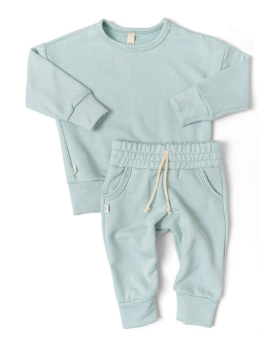 Boxy Set: Our new boxy sweatshirt has a loose, casual, unisex fit, and a rib collar. Made of our signature soft & cozy french terry fabric which has been milled and pre-washed just for our line. So cute & versatile on tiny babies & big kids alike! Cozy, straight leg pants with a wide elastic waistband, faux drawstring, functional pockets and cuffs at ankle. These gender neutral sweats mix & match so well with hoodies and tops and are perfect for newborns all the way up to 10/11 year olds! Made of our signature soft & cozy cotton french terry which has been milled and pre-washed just for our line. Fabric content: 45% cotton, 35% viscose, 20% polyesterRead More -
