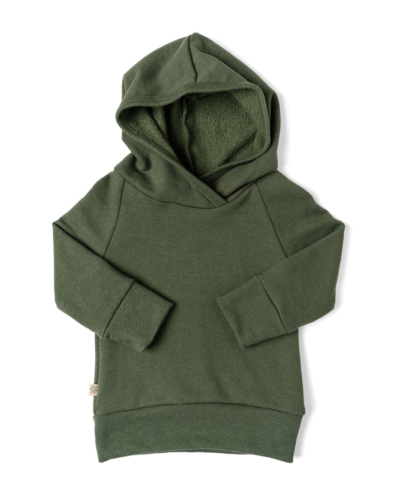 a cozy hoodie with raglan sleeves and a band around the hood, cuffs, and bottom in our trademark raglan style with small logo seam tag.